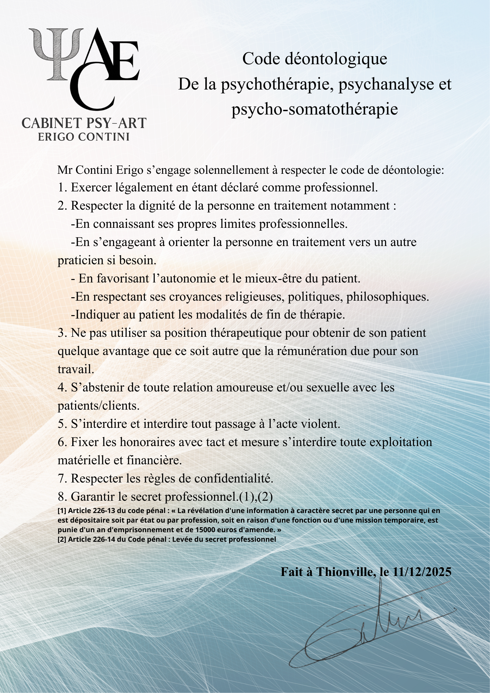 Cet engagement inclut le respect du code déontologique ci-dessous: